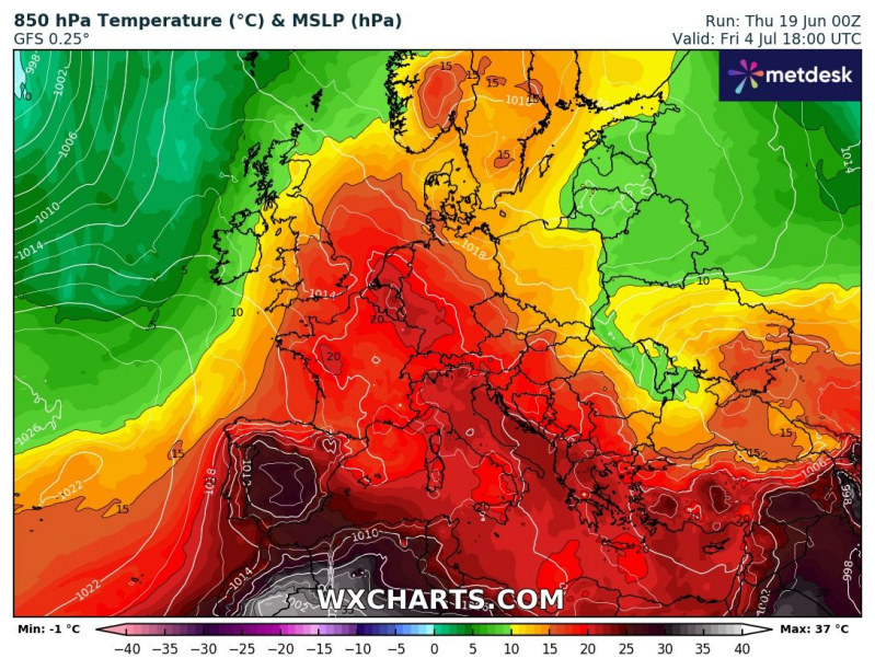 Echter word het spannend, wat er van de ergste hitte overblijft bij zijn tocht naar het noorden, de weermodellen komen met hoge kansen, op temperaturen van 5 dagen rond de 37-42 gr wat niet ondenkbaar is. dit is voor Nederlandse begrippen veelste warm, en aardig uniek te noemen waar de weermodellen mee komen. de temperaturen voor later deze maand en begin juli zijn niet grappig meer te noemen, GFS, maar ook ECMWF zijn het warmst, met gemiddeld 33-36 gr, met uitschieters tot 38-42 gr, we moeten het nog aan zien wat er tegen die tijd van de extreme hitte over is. voor nu zijn de kansen erg groot. bij dit is alles is er ook regelmatig kans op onweer of zwaar onweer, mits dit in verwachting blijft.