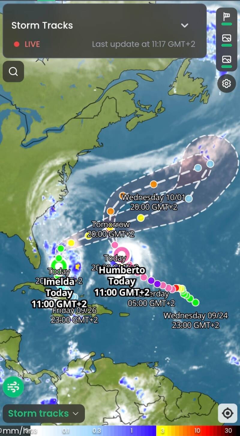 dit zijn kansen die Humberto met zich mee kan brengen, orkaan IMELDA die nu in het kielzog van Humberto volgt als categorie 3, lijkt halverwege deze week opgenomen te worden in het Systeem van Humberto rond Woensdag. daarna wordt het onzeker, maar optie 1,2,3 lijken meest voor de hand liggend te zijn, met Optie 2 als grootste kans van uitkomst. de kansen op vroege winter signalen zijn er voorlopig nog niet inbeeld, eerder een rustig ogende oktober met eerst wisselvallig en Stormachtig weer door Ex-systeem Humberto, later volgen nieuwe signalen voor hogedruk boven de Noordelijke regionen.