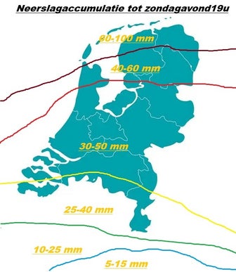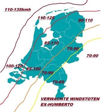in de avond en nacht naar zondag blijft het vooral in het Noorden en noordwesten stormachtig met zware windstoten, in de rest van het land blijft het iets rustiger met een vrij krachtige tot harde wind uit het Noordwesten. in de loop van zondag volgt het 3e windveldt van ex-systeem Humberto, het zwaarste windveldt lijkt dan weg gelegd voor Denemarken met 120> kmh, maar ook Noord en Noordwest Nederland houden te maken met zware windstoten van rondt de 100 kmh, daarbij vallen er opnieuw stevige buien, maar iets minder zwaar als zaterdag.