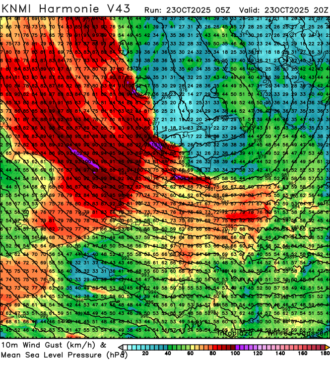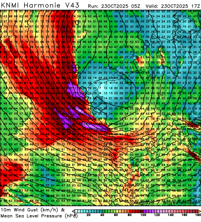 vanmiddag breid het stormveld zich geleidelijk aan uit over de rest van het land, waarbij in de kust provincies het tot zeer zware windstoten kan komen van rond de 110-130 kmh, afhankelijk van de intensivering. dieper landinwaarts komt het rond 80-95 kmh naar mate het noordelijker trekt, lokaal misschien nog ietsje hoger.