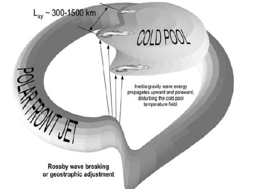 Onderstaande schema geeft de interactie weer tussen een sterke breuk in de polaire straalstroom (gekoppeld met een golf) en de opwaartse interactie met de SPV.