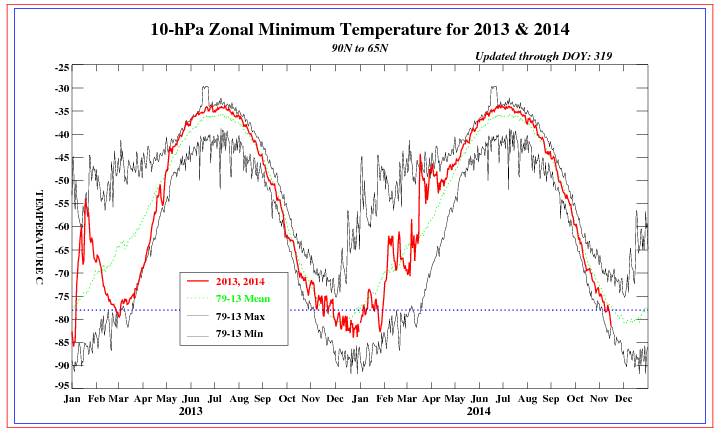 De SPV ontstaat boven de polen tijdens de wintermaanden aldaar wanneer het zonlicht de stratosfeer niet meer opwarmt (o.a door het daar aanwezige ozon). Hierboven zie we de noordelijke hemisfeer met de temperatuur op 850K (rond 20 hPa) op 15 november. We zien hierop duidelijk dat de SPV goed en wel ontwikkeld is en zijn kern nabij het oosten van Groenland heeft met een minimale temperatuur rond -80 graden. Het kwik op deze hoogte (20 à 25 km hoogte, of in druk: tussen pakweg 10 en 30 hPa) kent een duidelijk jaarlijks verloop en schommelt tussen zo’n -35 graden in de juli en ongeveer -80 graden in januari. Het verloop van de laatste 24 maanden is hieronder weergegeven.
